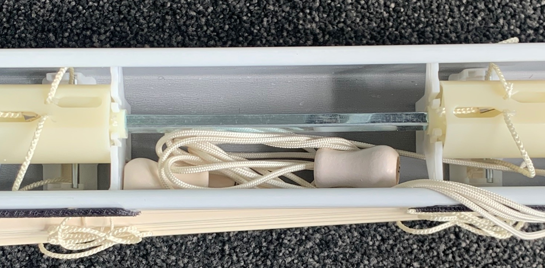 ![]() | Notice the control cords are tucked into the headrail in a clear bag. Carefully lift the control cords out of headrail, and remove the clear bag. Leave blind in the mostly pulled up position, or can lower a little bit, by pulling the lifting cord across. |